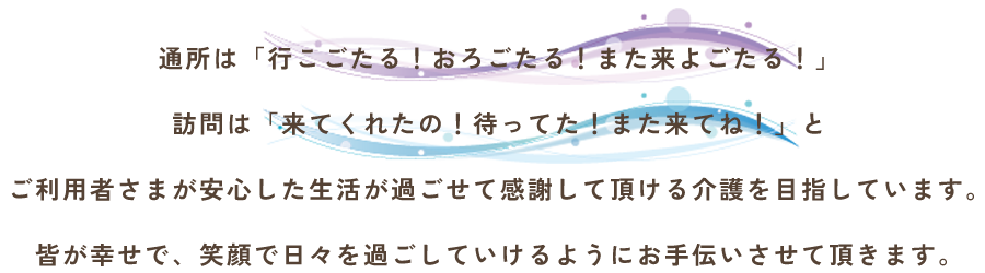 | 運営事業所 | >ヘルパーステーション瑠璃 介護保険事業所番号 4370301162 障がい福祉サービス事業所番号 4310600277 >デイサービス凛 介護保険事業所番号 4370301337 |